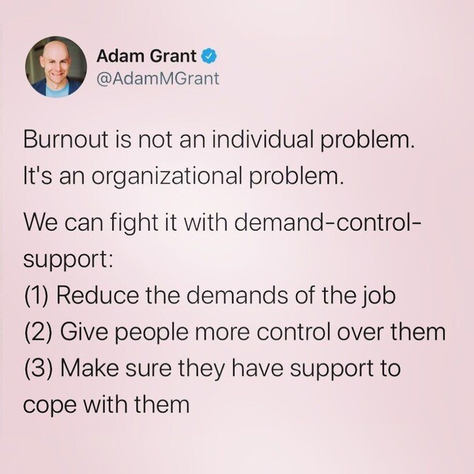Adam Grant notes that “Your work place is often responsible for the cause of burnout – they should take responsibility for the cures.”